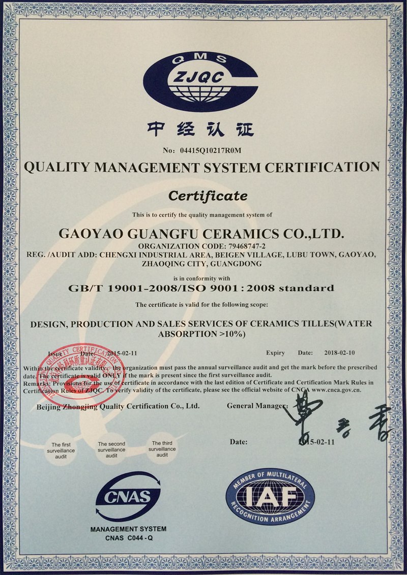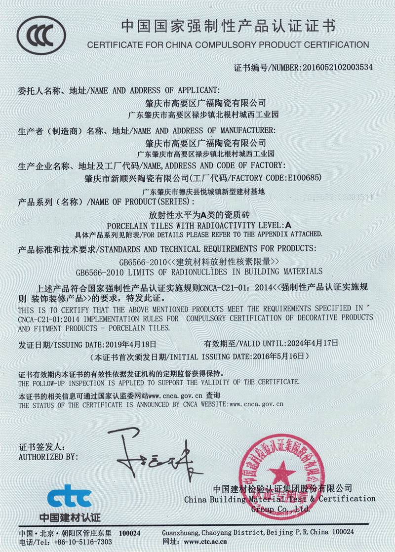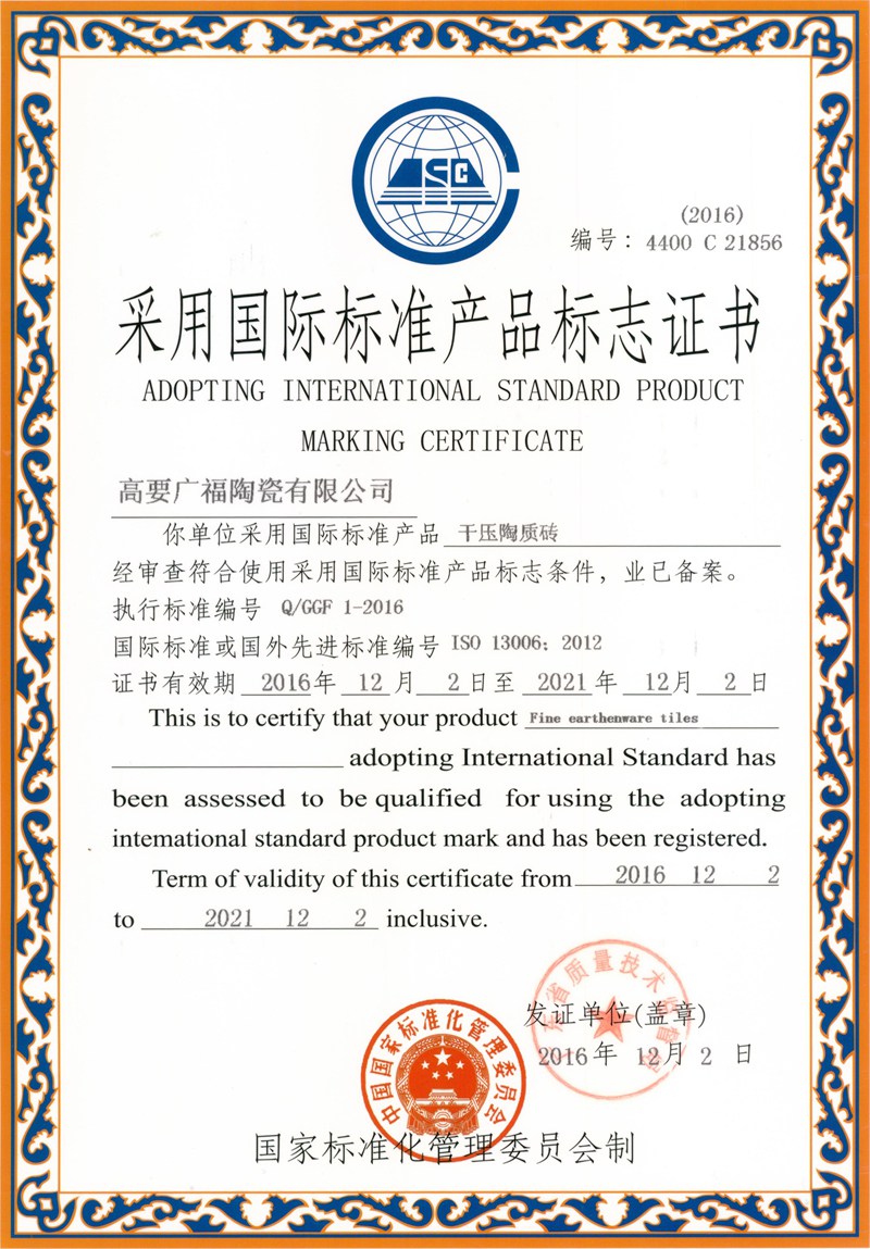 公司占地面积500多亩,拥有良好的基础设施设备,包括目前国内最长360米长的多条窑炉生产线,配备进口超大吨位压机、大型喷雾干燥塔、全自动印花机、滚筒印花机等,通过ISO14001:2004环境管理体系、ISO9001:2000质量管理体系认证及中国环保产品认证并严格按上述标准实施生产与管理,并获得中国著名品牌和瓷砖十大品牌的荣誉称号。公司主要研发、生产、销售300×300mm 、300×450mm、300×600mm及大规格400×800mm、300×800mm 、300×900mm等花色品种的完全不透水高级喷墨釉面内墙砖、高品质的800×800mm、600×1200mm、800×1600mm规格通体大理石系列、金刚石系列、一石多面系列等产品,并一直致力于新产品的开发。以高品质高性价比的产品,结合人们不断提升的物质与精神需要,形成独特品位。